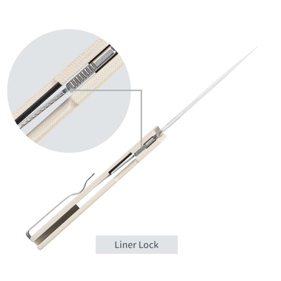 Клинок відкривається натисканням на невидимий фліпер, повністю схований у силуеті. У такий спосіб виступ не чіпляє кишеню та не порушує чисті лінії дизайну. Осьовий вузол працює на сталевих підшипниках, що дають плавний хід леза.