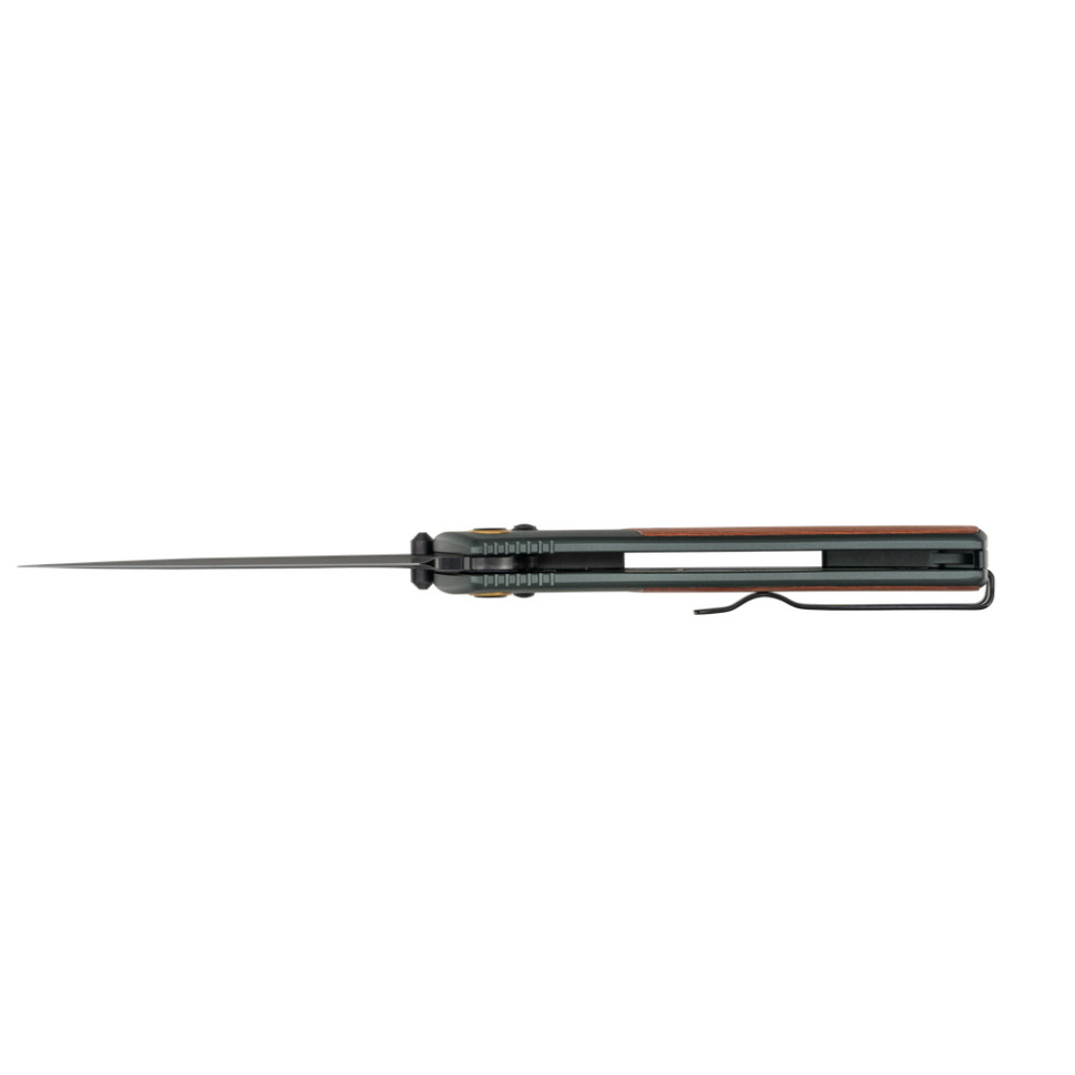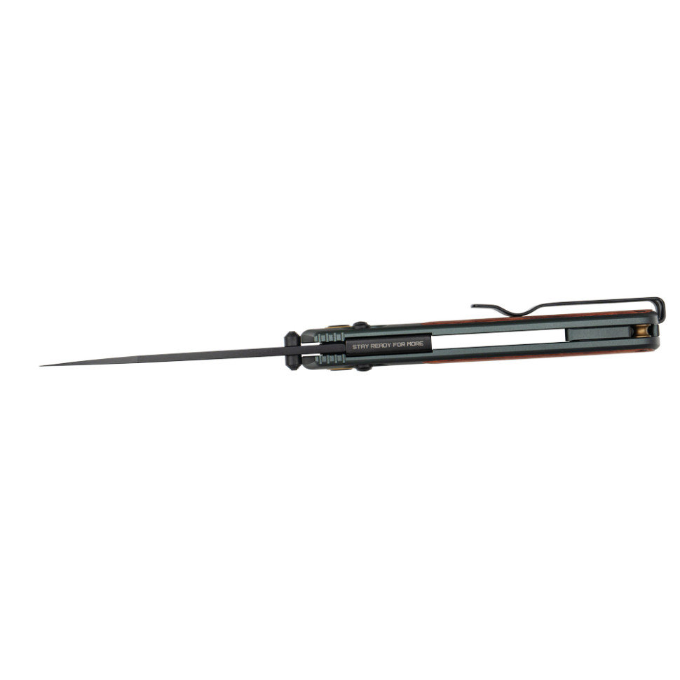 Клинок з профілем зворотний танто має гострий посилений кінчик для роботи на проколювання, водночас подовжена пряма кромка демонструє акуратне різання. В основі вузла знаходяться керамічні підшипники, які забезпечують швидке відкриття конструкції без ривків.