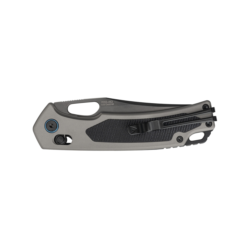 - Алюмінієве руківʼя зі вставками G10. Основою слугує легкий та жорсткий анодований алюміній, який знижує загальну вагу ножа та формує міцний каркас. Вставки з шорсткого композиту додають чіпкості, сприяючи міцному утриманню конструкції для безпечної роботи.