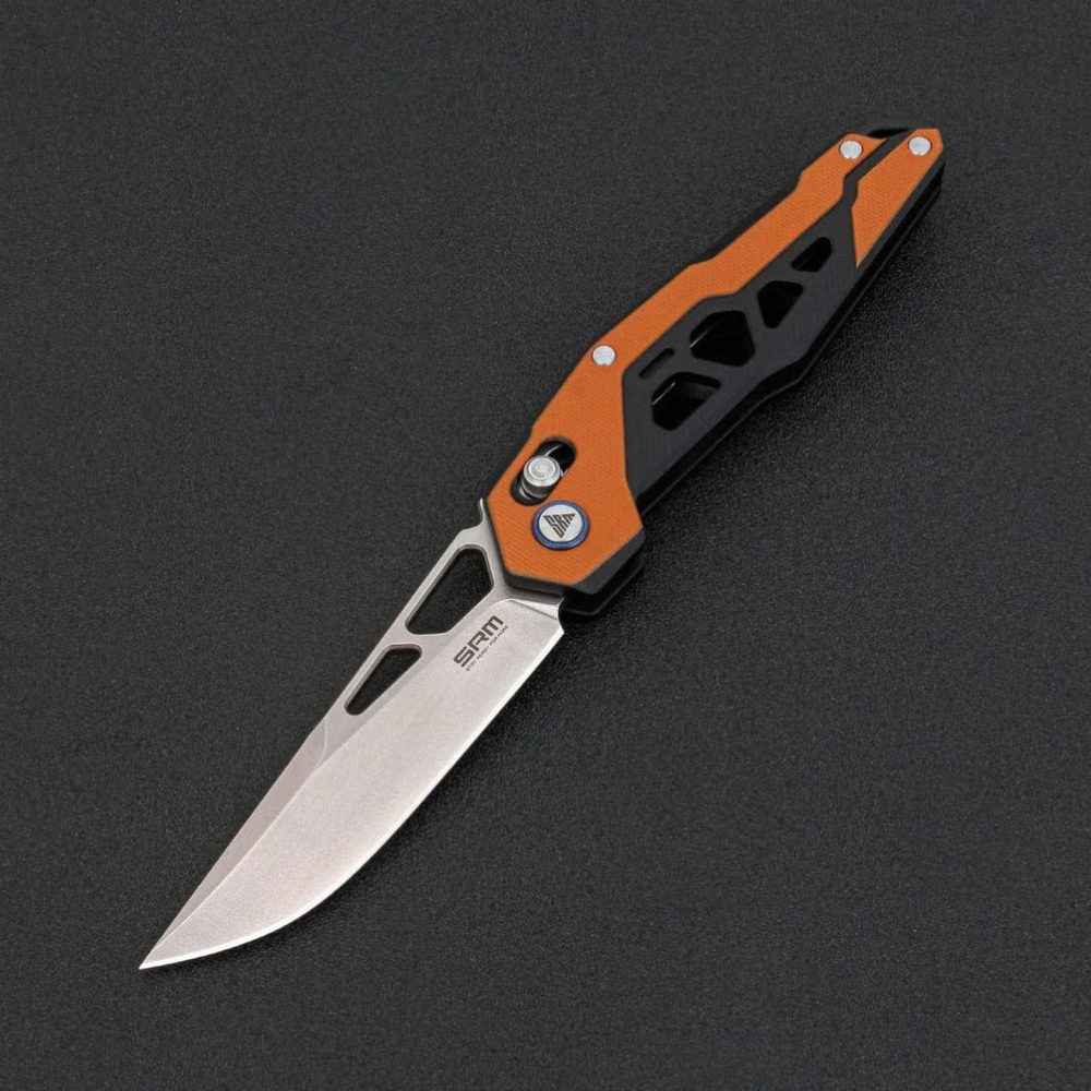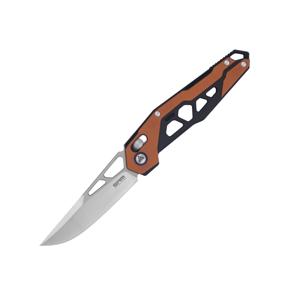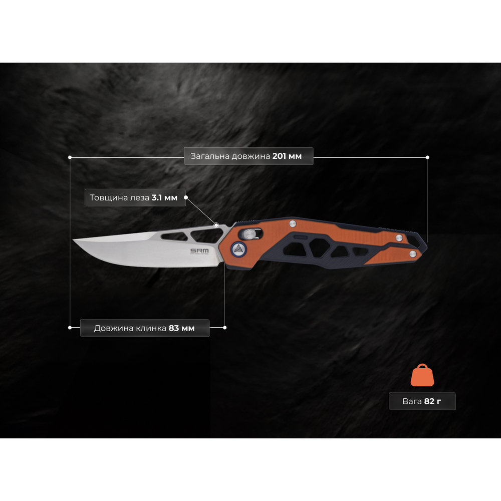 Складаний ніж SRM Mecha поєднує агресивний утилітарний дизайн та зносостійкі матеріали. Завдяки полегшеному руків'ю вагою всього 82 г, модель ідеальна для щоденного використання та виконання складних робіт, зокрема для різання цупкого картону, пластикових стяжок або зачистки дротів.