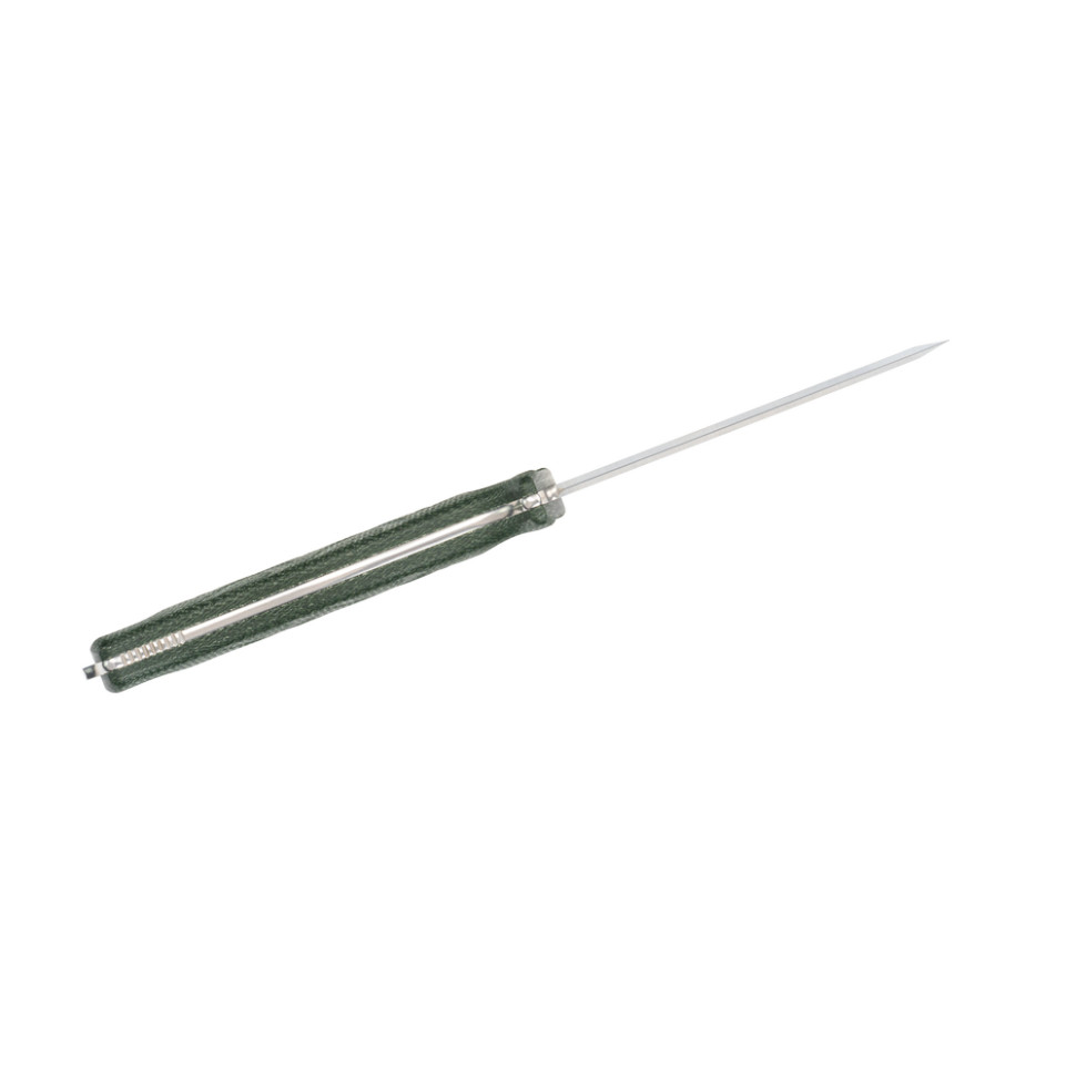 - Рукоять — микарта. Слоистый композит на тканевой основе обеспечивает цепкий хват даже во влажной среде и в перчатках — все благодаря шероховатой, приятной на ощупь текстуре. Материал устойчив к влаге и перепадам температур, выдерживает механические воздействия. Мягкие изгибы рукояти уменьшают давление на ладонь.