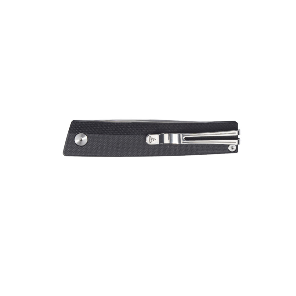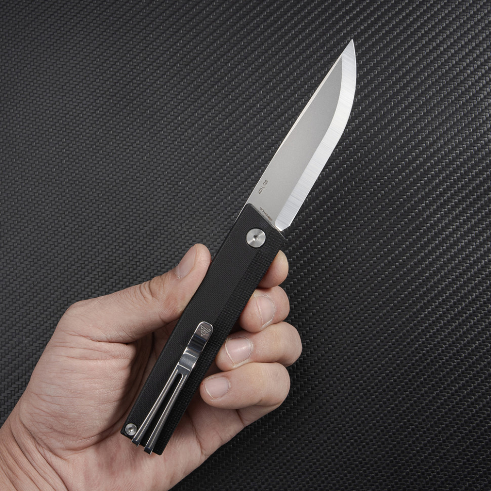 - Шероховатая рукоять G10. Стеклотекстолитовые плашки закреплены по обе стороны рукояти. Композит повсеместно используется в карманных ножах, поскольку невосприимчив к механическим повреждениям, держит форму в случае температурных перепадов и не впитывает воду.