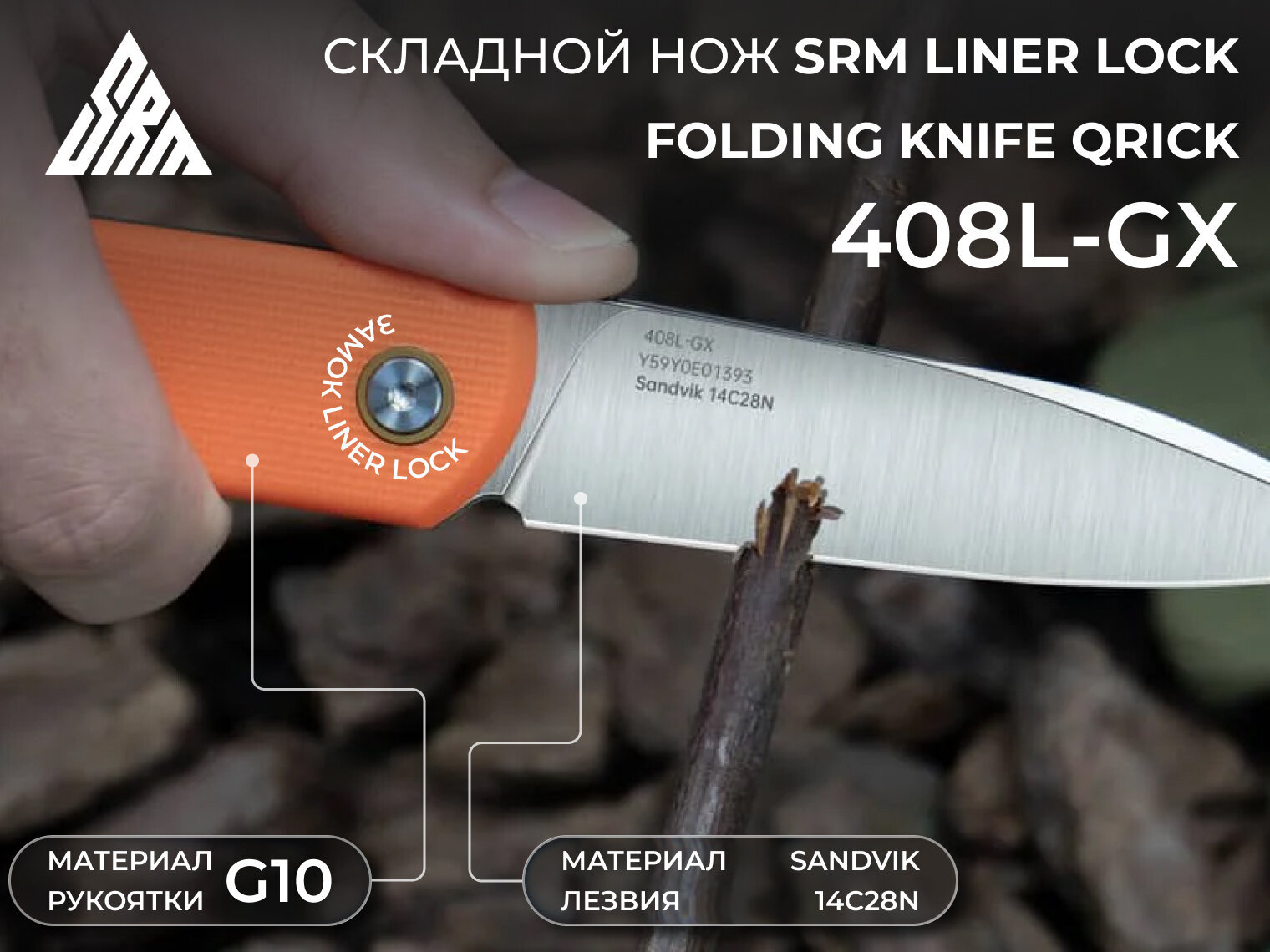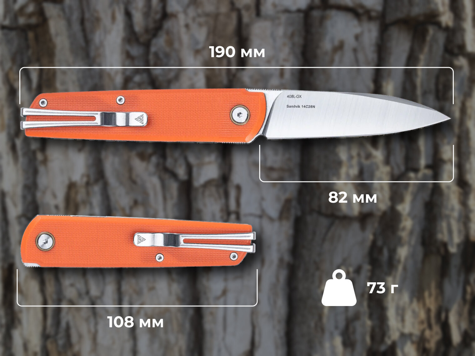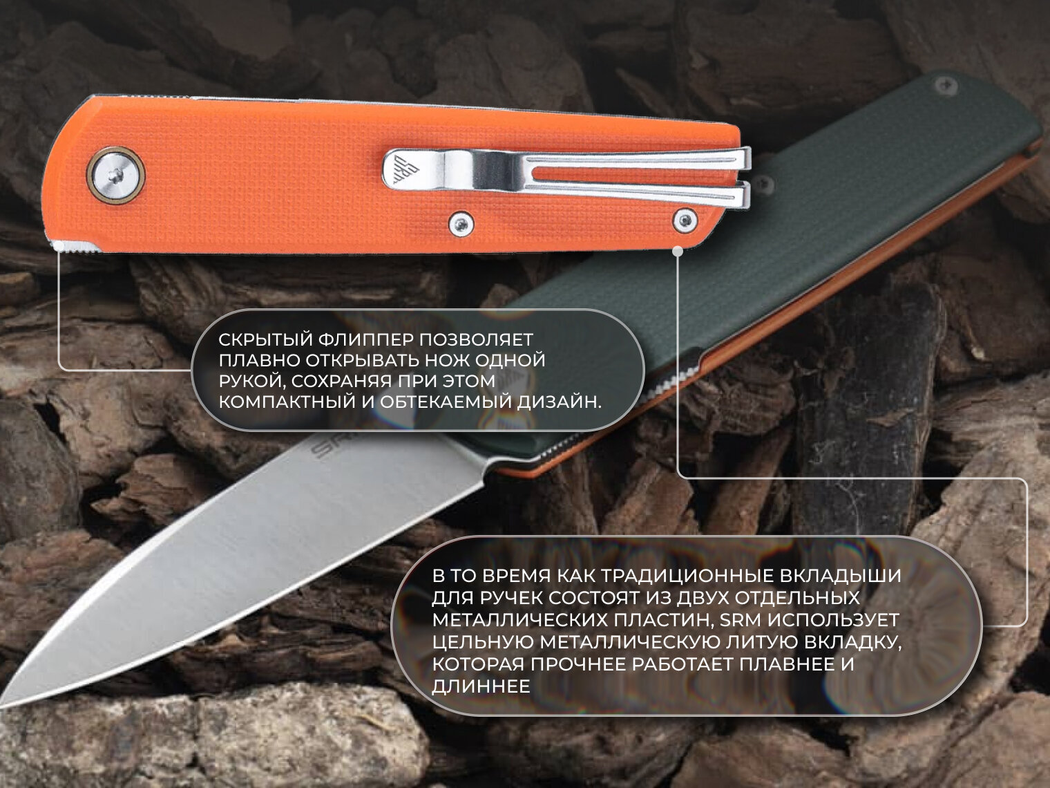 Визуально нож 408L-GX от SRM имеет строгое и аккуратное оформление: тонкий профиль и чистые линии с акцентными плашками делают посадку на кармане простой и удобной. Для фиксации предусмотрена фирменная клипса Ambi Clip из нержавеющей стали — ее можно устанавливать на любую сторону рукояти без использования дополнительных инструментов.