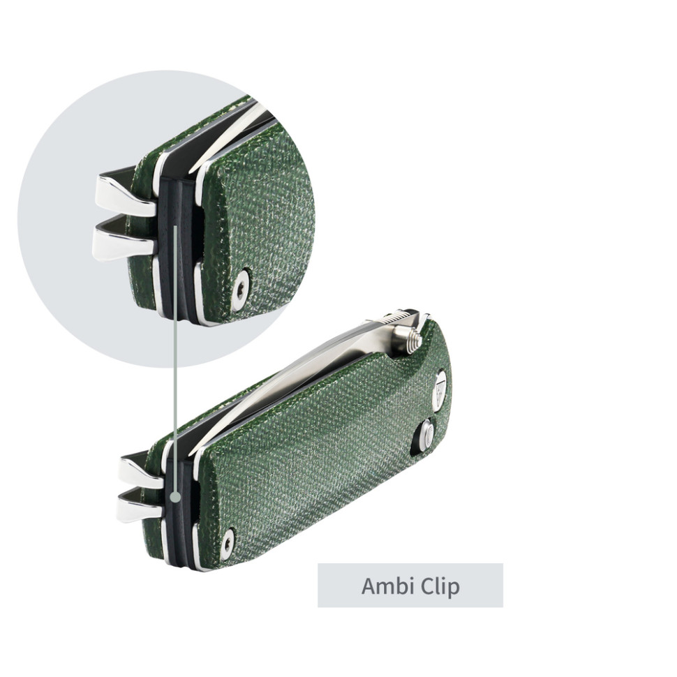 Запатентованная клипса Ambi Clip с посадкой Tip-Up зафиксирована в хвосте рукояти и позволяет полностью спрятать инструмент в кармане. При необходимости зажим быстро переносится на другую сторону рукояти — для этого не нужны дополнительные инструменты.